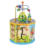 A felső rész gyöngyös útvesztője a fogás és a finommotorika edzésére szolgál, az oldalsó panelek pedig formaszortert, fogaskerekeket, abakuszt, számokat, útvesztőt és további tevékenységeket kínálnak. Az alsó oldal a „Ki nevet a végén?” társasjátékot rejti bábukkal és dobókockákkal – ideális a közös családi szórakozáshoz.
