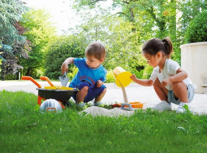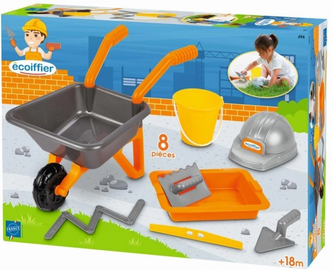 Szuperkészlet homokos építkezéshez, 8 darabos. Talicska, vödör, vízmérték, összecsukható mérőszalag, kőműveskanál, simító, tál és védősisak.