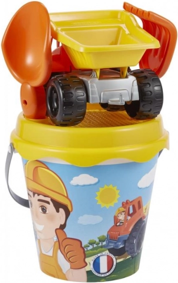 Szórakoztató homokozó készlet kis építőknek, amely tartalmaz egy vödröt, egy szitát, egy teherautót, gereblyét és egy lapátot. Ideális játszótérre és strandra, a vödör 17 cm átmérővel és 18 cm magassággal.