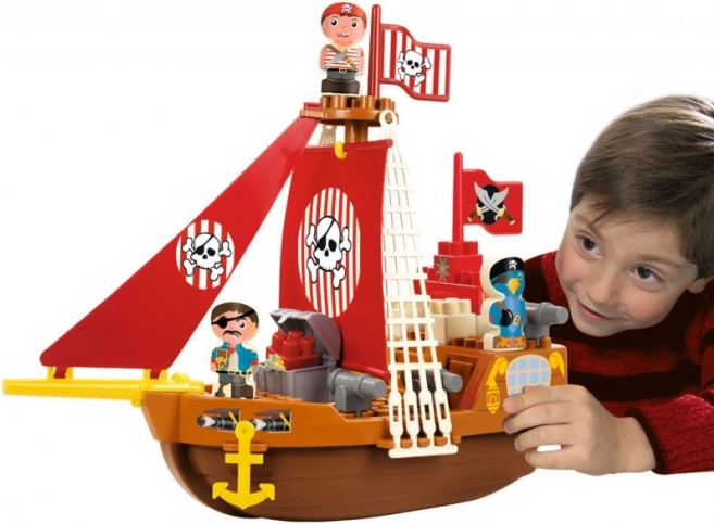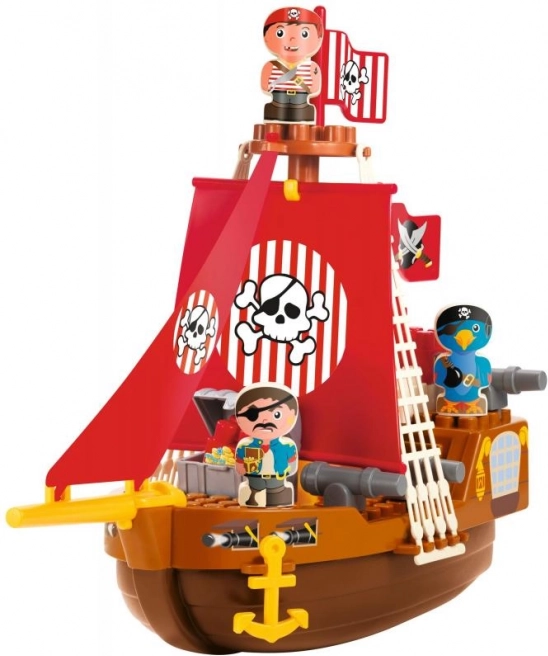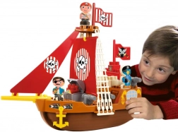 A hajó részletes elemekkel van felszerelve, mint például a koponya és keresztbe tett csontok motívummal díszített piros vitorlák, amelyek autentikus kalózélményt nyújtanak a gyerekeknek.