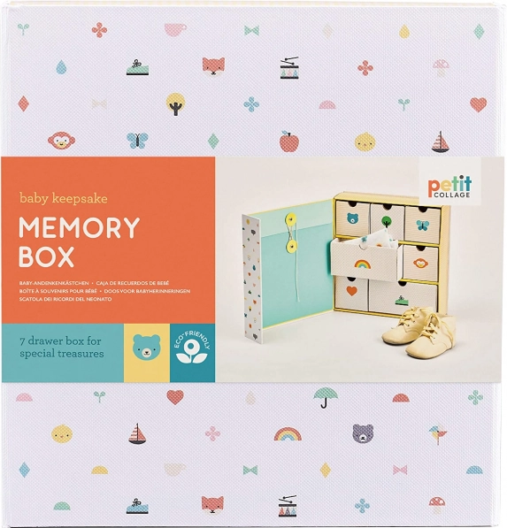Őrizze meg kisbabája első kincseit stílusosan és fenntarthatóan. Ez a design emlékdoboz a Petit Collage-tól 7 fiókkal és egy praktikus zsebbel kínál helyet olyan apróságoknak, mint az első ruhácska, egy hajtincs vagy a kórházi karszalag. Újrahasznosított papírból készült és műanyagmentes csomagolású, tudatos szülőknek ideális választás, és egyedi ajándék újszülötteknek is.