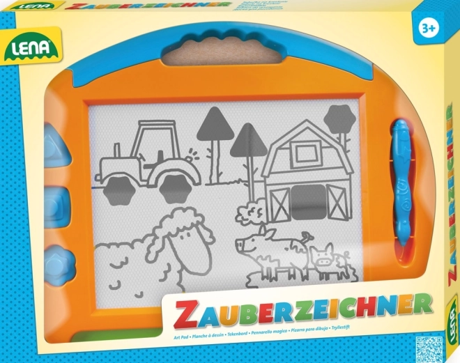 Ez a mágneses tábla ideális játék az első rajzokhoz és a formák tanulásához. A praktikus csúszkával a rajz egy szempillantás alatt letörölhető, és kezdődhet elölről – rendetlenség és papír nélkül. A fémhegyű stylus zsinórral rögzített, így nem vész el, a három mágneses pecsét pedig vidám minták készítésében segít.