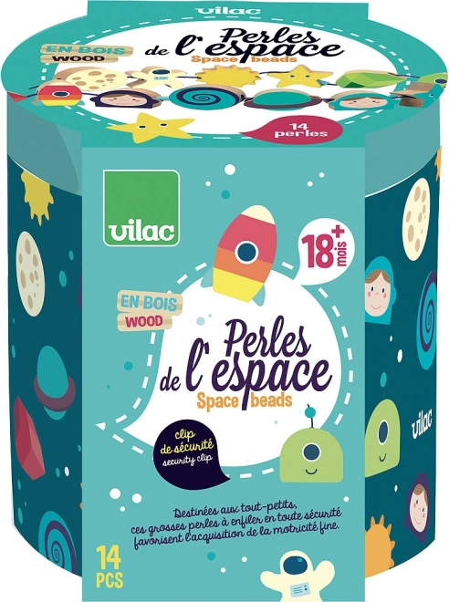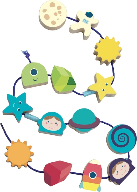 Gyönyörű űrbéli fűzős játék, kiváló a finommotoros készségek fejlesztésére gyermekeknél. 14 gyönyörűen illusztrált fa gyöngyöt tartalmaz, mint például űrhajós, hold, nap és rakéta.