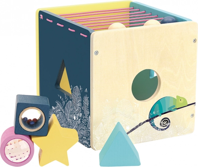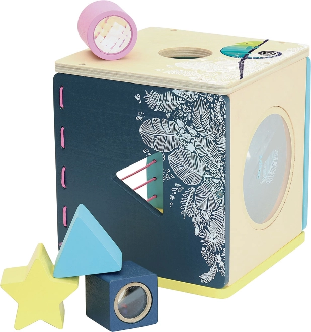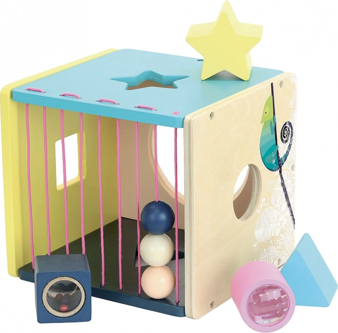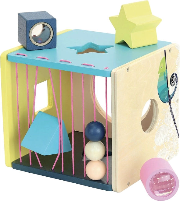 A kocka modern és eredeti dizájnt kapott, amely szenzorikus kockák és rugalmas zsinórok formájában új játék elemeket tartalmaz. Belül további gyöngyöket találunk, melyek szórakozást és tanulást biztosítanak a gyerekek számára. Ez a termék kitűnő választás minden játékos gyermek számára.