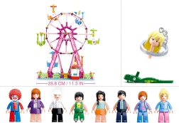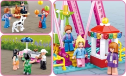 A szett központi eleme a nagy, rózsaszín-kék óriáskerék működő forgatással és több kabinnal. A gyerekek könnyedén megpörgetik az attrakciót, élethű vásári hangulatot teremtve.