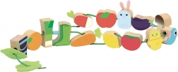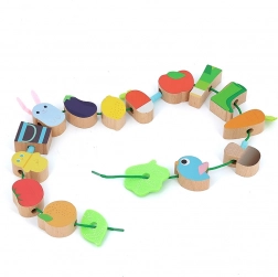 A játék minőségi fából készült, egészségre ártalmatlan festéssel. A textil zsinór biztonsági végződései könnyű és biztonságos felfűzést biztosítanak, így a gyerekek önállóan vagy szülőkkel együtt is játszhatnak. A fűzős játék fejleszti a finommotorikát, a logikus gondolkodást és a vizuális észlelést.