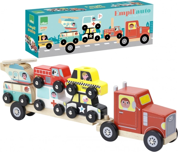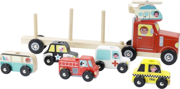 Színes fa készlet kamionnal és pótkocsival, amely órákon át tartó kreatív szórakozást nyújt 2 éves kortól. A hosszú pótkocsira 6 jármű helyezhető fel – taxi, rendőrautó, tűzoltóautó, mentőautó, helikopter és kisbusz. A játék minőségi fából és fémből készült, sima kidolgozású, és fejleszti a finommotorikát, a kéz–szem koordinációt és a fantáziát. A dizájnt a neves illusztrátor, Ingela P. Arrhenius készítette.