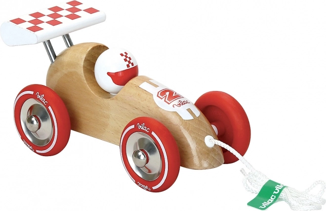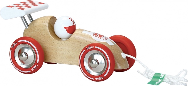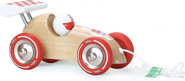 Ez az elegáns fa versenyautó feltűnő piros részleteivel és szárnyával első pillantásra elnyeri a gyerekek tetszését. A zsinór segítségével könnyen magukkal vihetik a lakásban és a szabadban is, húzás közben pedig természetesen fejlődik a stabilitásuk és a koordinációjuk. A gumírozott fém kerekek sima és halk gurulást biztosítanak.