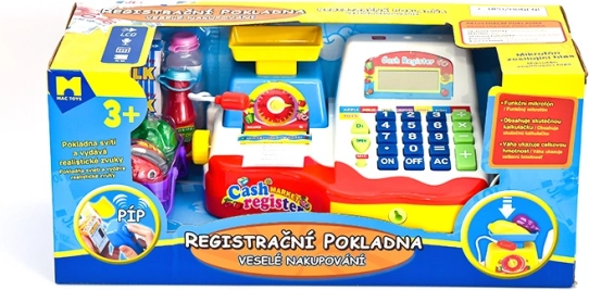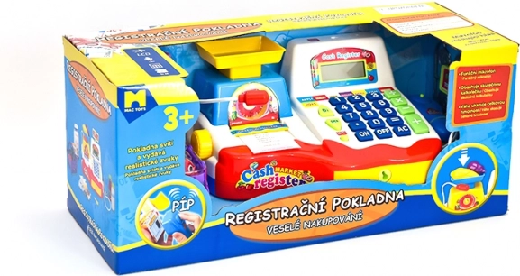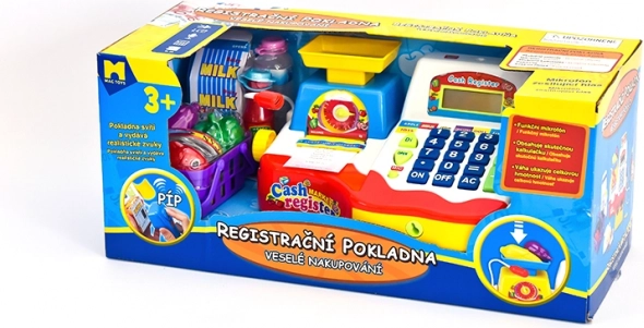 Kedvelt persely-pénztár kihúzható pénzfiókkal, működő gombokkal, mikrofonnal, mérleggel, kosárral és számos élelmiszer-makettel a kis kereskedőknek. Elemmel működő termék. 3 éves kortól ajánlott.