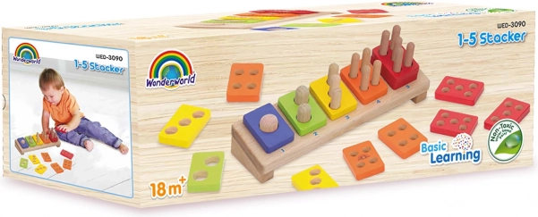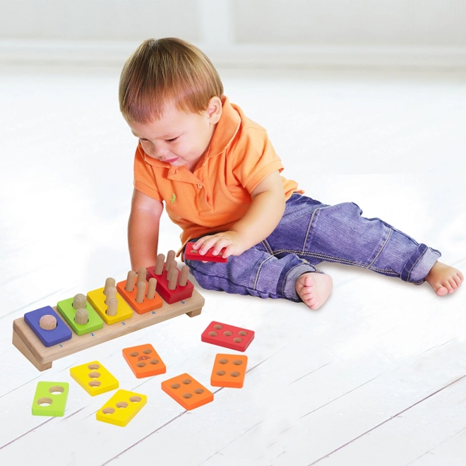 Ez a minőségi, fából készült fejlesztő játék természetes módon megtanítja a gyerekeknek a színek felismerését és az 1–5 számok sorrendjének megértését. Minden lapka a megfelelő számú nyílással rendelkezik, a gyerekek pedig az alap csapjaira fűzik fel őket, így gyakorolják a számolást és a logikus gondolkodást.