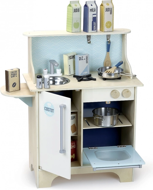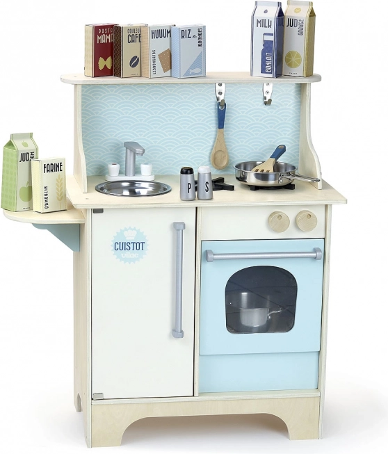 Stílusos, kék színű gyerek konyha, amely elragadtatja a kis szakácsokat. Masszív fa szerkezetet, kattanó tűzhelygombokat, mosogatót és sütőt, valamint gazdag tartozékkészletet kínál a valósághű játékhoz. 3 éves kortól ajánlott.
