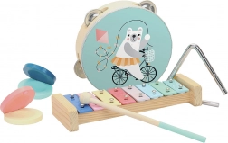 A szett mindent tartalmaz egy kis otthoni zenekarhoz: színes xilofont ütővel, mackós tamburint, tisztán szóló triangulumot és egy pár kényelmes kasztanyettát. Ergonomikus kialakításának köszönhetően a hangszerek jól illenek a kis kezekbe, és motiválják a gyerekeket a zenélésre.