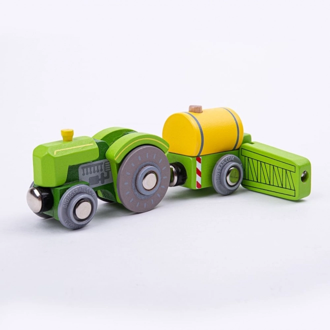 A zöld traktor pótkocsival és permetezővel remek kiegészítő a mezőgazdasági készletekhez és a hagyományos vonatpályákhoz is. Az univerzális mágneses kapcsolódásnak köszönhetően a kocsik könnyen összekapcsolhatók, bővítve a játékélményt a farmon és a síneken egyaránt.