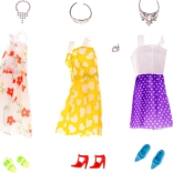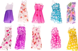 A szett különböző színű és mintás ruhákat tartalmaz, beleértve a pöttyöket, szíveket és virágokat, ideális a kreativitás kibontakoztatására a babák öltöztetése során.