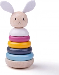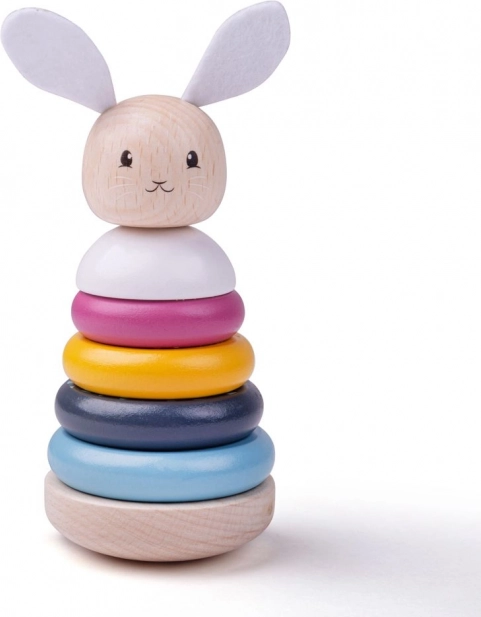 Ez a minőségi, pasztellszínű fa rakosgató ideális első fejlesztő játék. A gyerekek a legnagyobbtól a legkisebbig rakják egymásra a karikákat, miközben fejlődik a szem–kéz koordináció, és megtanulják megkülönböztetni a színeket és formákat. A nyuszi textil fülecskéi és farka taktilis élménnyel gazdagítják a játékot.