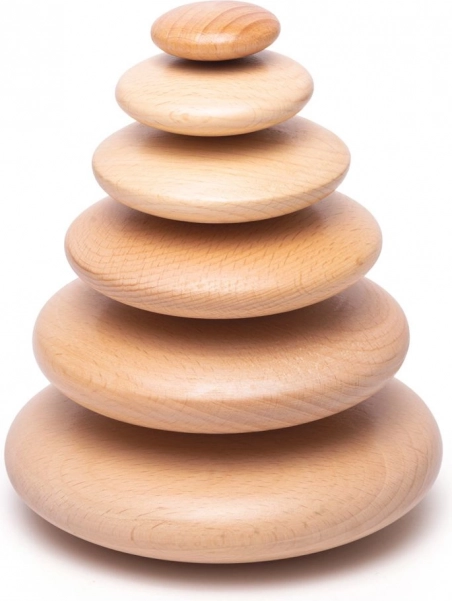 Ez a nyitott, útmutató nélküli egyensúlyozó játék a gyerekek saját fantáziájára épít: építhetnek tornyokat, alkothatnak mintákat, méret szerint válogathatnak, vagy a kavicsokból stílusos díszt készíthetnek a szobába. A fa természetes megjelenése és sima felülete kellemes tapintási élményt és nyugodt, koncentrált játékot biztosít.