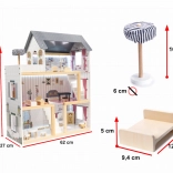 Stílusos MDF fa babaház elegáns fekete színben, három emelettel, gazdag bútorfelszereléssel és hangulatos LED világítással. A masszív MDF szerkezetnek köszönhetően stabil és tartós, míg a 16 darab bútorelem lehetővé teszi a konyha, nappali, hálószoba, fürdőszoba és tetőterasz kreatív berendezését.