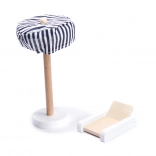 A tetőterasz nyugággyal és csíkos napernyővel ideális a babák pihenéséhez, és élethű jeleneteket teremt a játékhoz.
