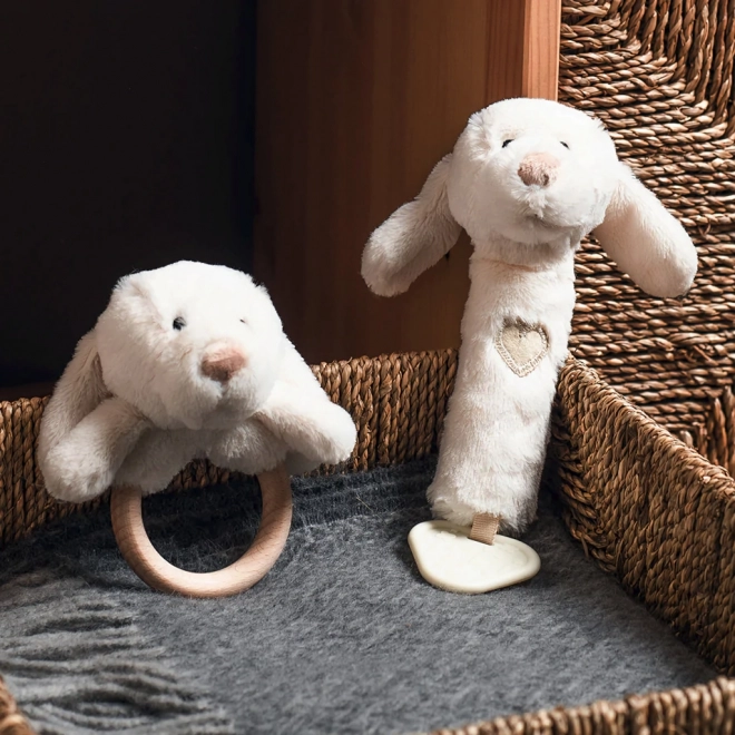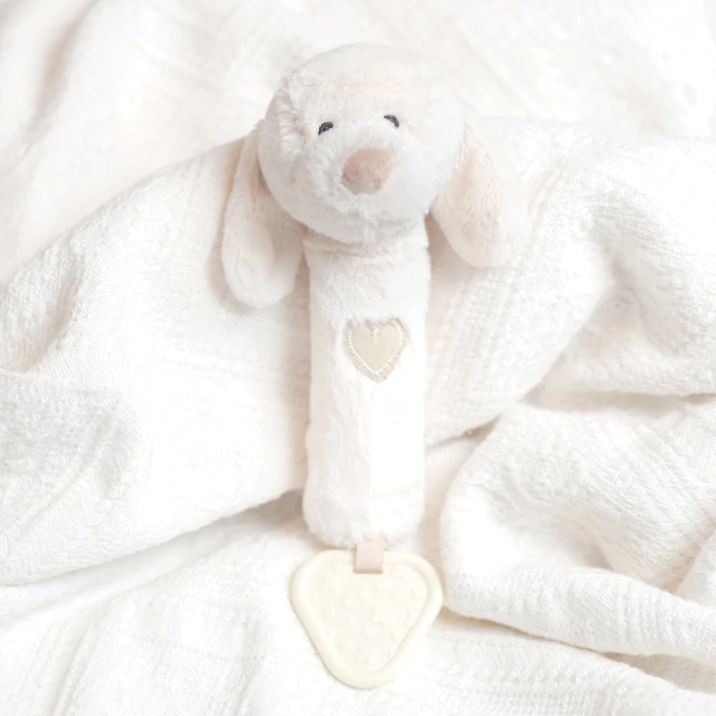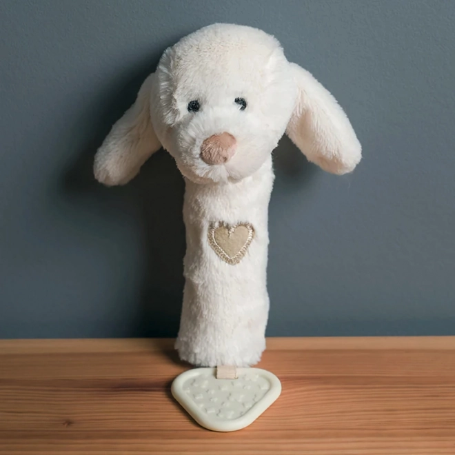 Ez a sokoldalú, puha kutyus alakú játék három élményt kínál egyben: finom csörgés a hallás fejlesztésére, mókás síp megnyomásra, valamint texturált rágóka a fogzás okozta kellemetlenségek enyhítésére. Semleges, természetes árnyalata illik bármely babakelengyéhez.
