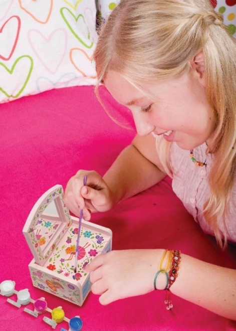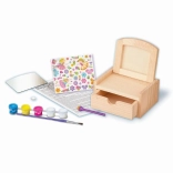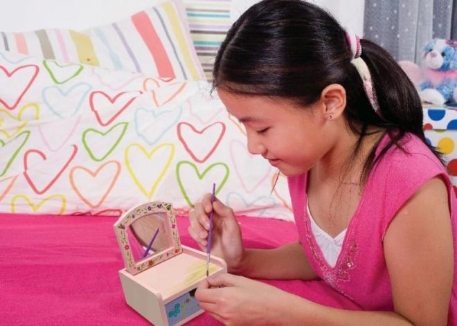 Fedezd fel az alkotás örömét ezzel a csodás kozmetikai ládikával. A készlet lehetővé teszi, hogy kifestd és kidíszítsd saját kis kincses ládikádat – ideális kreatív gyerekeknek.