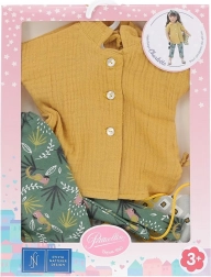 A trópusi növény- és madármintás zöld nadrág friss, játékos megjelenést kölcsönöz a babának. A minta szépen harmonizál az okkersárga blúzzal.
