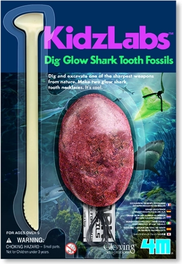 Tartalmaz 2, a sötétben világító cápafogat gipszblokkba öntve, speciális eszközt, zsinórt és útmutatót.