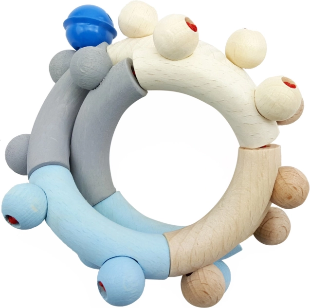 Magas minőségű fa csörgő, ideális a képzelőerő serkentésére és a gyermek finom motorikus készségeinek fejlesztésére. A csörgő szemet gyönyörködtet pasztell színeivel, és etikus módon, környezetbarát erdőkből származik.