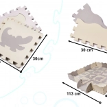 Nagy méretű hab elemek kivehető állatformákkal, amelyek támogatják a forma-felismerést, a kreativitást és a finommotorikát. Az elemekből könnyedén összeállítható egy sík szőnyeg vagy megemelet peremű elkerített rész, amely biztonságos játszózónát jelöl ki. A texturált felület kellemes tapintású és nem csúszik.