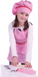 A készlet mindent tartalmaz az első főzéshez és sütéshez: 56 × 43 cm-es kötényt, szakácssapkát, edényfogót, fa nyújtófát és süteménykiszúrókat. Ideális játékkonyhába és közös, felügyelettel végzett sütéshez is.