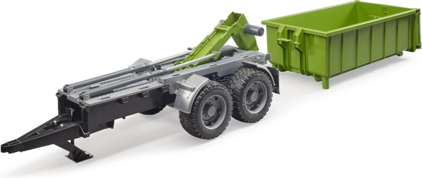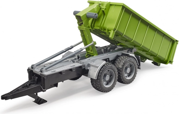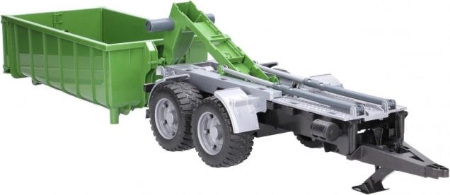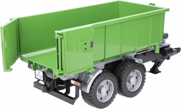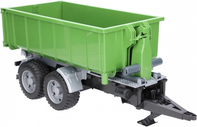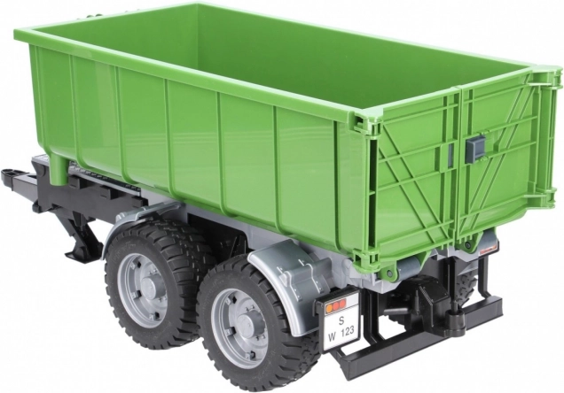 Ez a valósághű BRUDER utánfutó zöld‑fekete kivitelben sokoldalú konténerrel bővíti bármelyik traktort. A billentő mechanizmusnak és a nyitható hátsó falnak köszönhetően a rakomány könnyen kirakodható, a konténert pedig le is lehet venni az alvázról és önállóan használni.