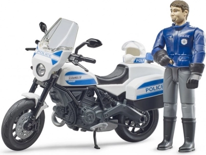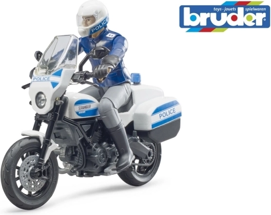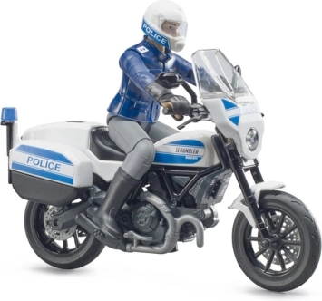 A Bruder DUCATI Scrambler rendőrmotorja igényesen kidolgozott modell a mentő- és rendvédelmi témák rajongóinak kicsiknek és nagyoknak. A motorkerékpár forgatható kormánnyal a könnyű manőverezésért és lehajtható oldaltámasszal a stabil leállításhoz készül. A rendőrfigura mozgatható végtagokkal rendelkezik, így vezetői pozícióba ültethető vagy a jármű mellé állítható.