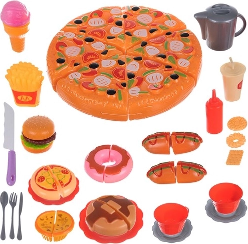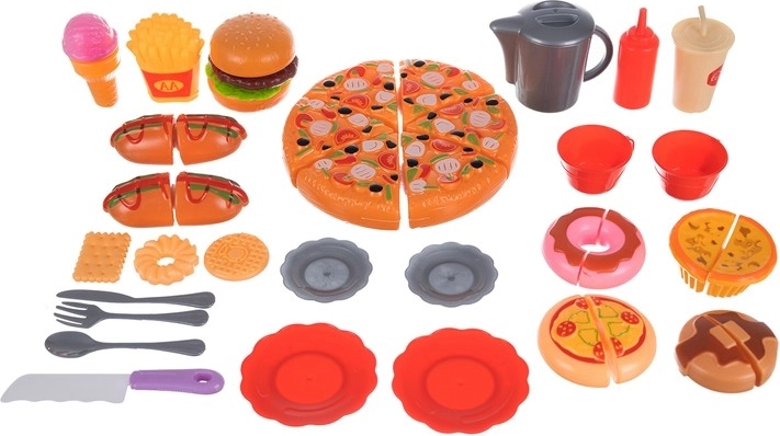 A gyorsétel játékkészlet tökéletes a kis szakácsok és szakácsnők számára, akik szeretnének játszani kedvenc ételeik elkészítésével. A gyerekek saját kombinációkat alkothatnak a 42 elem révén, melyet ez a készlet tartalmaz. A játékos színek és a valósághű design mindegyik részen nagyon élethűen hatnak, és serkentik a gyermekek képzelőerejét.
