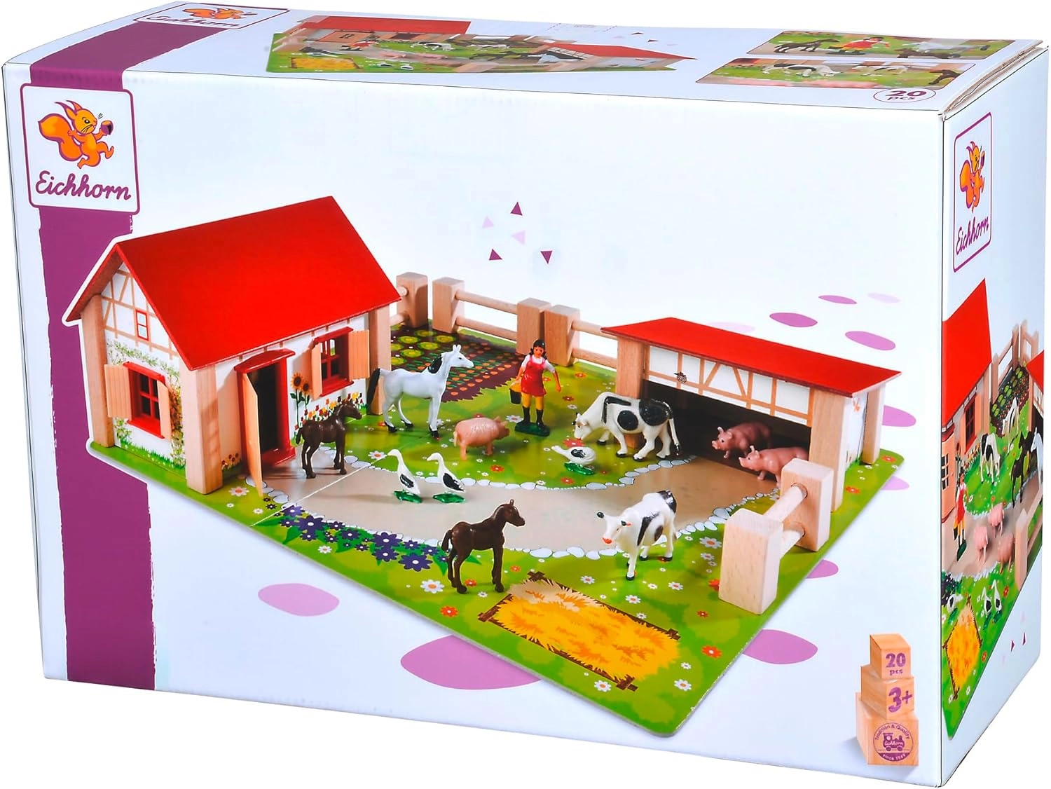 Az EICHHORN fa tanya örömet szerez minden kis gazdának. A szett tartalmaz piros tetős házat, istállót, kerítéseket és részletgazdag állatfigurákat, köztük lovakat, teheneket, malackákat és ludakat. A csomag része egy színes alap is utakkal és kiskerttel, amely könnyen irányt ad a saját jelenetek és történetek kialakításához. A masszív fa szerkezet és a tartós anyagok hosszú élettartamot és biztonságos játékot biztosítanak.