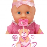 A baba rózsaszín ruhában van, mackó mintával és masnival. Nap mint nap kedvenc társ.