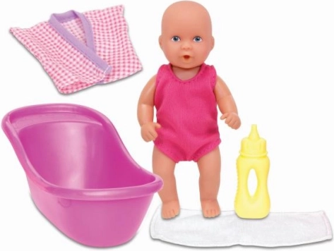 Panenka iszik és pisil ideális játék kis szülők számára. A szett tartalmaz fürdő kiegészítőket, beleértve a cumisüveget, kádat, törölközőt és köntöst.