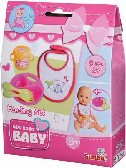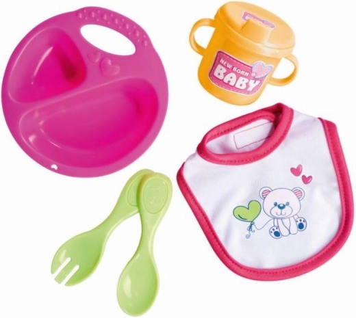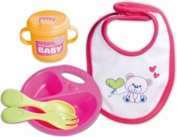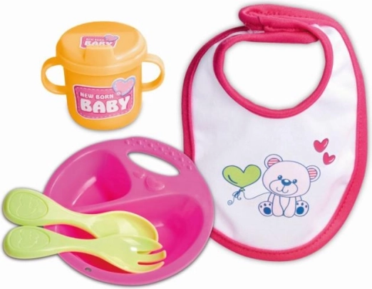 Aranyos babák etetőkészlete NEW BORN BABY 5 darabból áll – tányér, kiskanál, villa, bögre és előke – 30–43 cm-es babákhoz. A könnyű, könnyen tisztítható készlet ideális az etetős játékhoz és a finommotorika fejlesztéséhez.