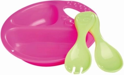 A könnyű, lekerekített formájú műanyag edények és az ergonomikus evőeszközök támogatják az önálló játékot és a finommotorikát.