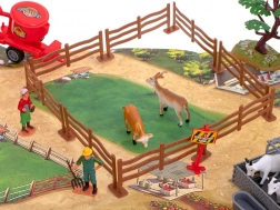 Tehén, bika, juh, kecske és további kiegészítők, hozzá gazda figurák és kerítéselemek a karámok kialakításához. Teljes felszerelés a valósághű játékhoz.