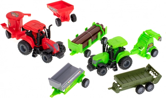 A készletben 2 traktor és különféle felépítmények találhatók – bálaszállító pótkocsi, vetőgép/kaszáló vagy bálázó. Kiváló a valós gazdasági munkák szimulálásához.