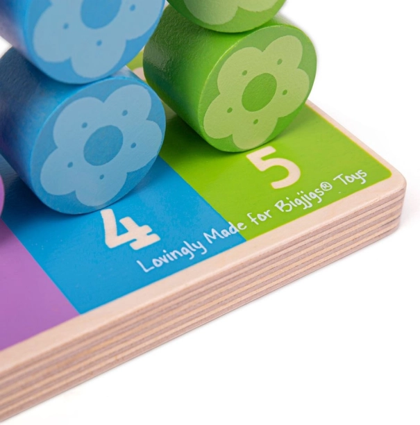 Minden oszlopnak megvan a saját száma és színe, így a gyerekek könnyen megértik a párosítás és a mennyiségek elvét. A virág alakú elemeket a kicsi kezek is kényelmesen meg tudják fogni, és ösztönzik az önálló játékot, valamint a közös felfedezést a szülőkkel.