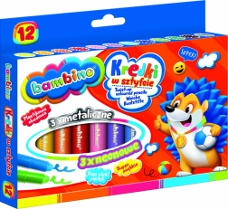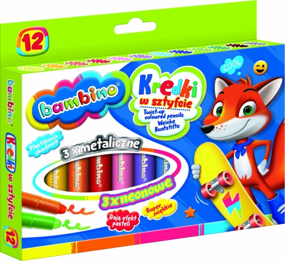 Engedd szabadjára a kreativitást a BAMBINO tekerhető viaszkrétákkal 12 szín készletben. Szuper puha, intenzív árnyalatokkal és pasztell hatással, a műanyag testnek köszönhetően nem koszolja a kezet. Remekül használható papíron, kartonon és fán, a készletben ráadásul 3 metál és 3 neon szín is található.