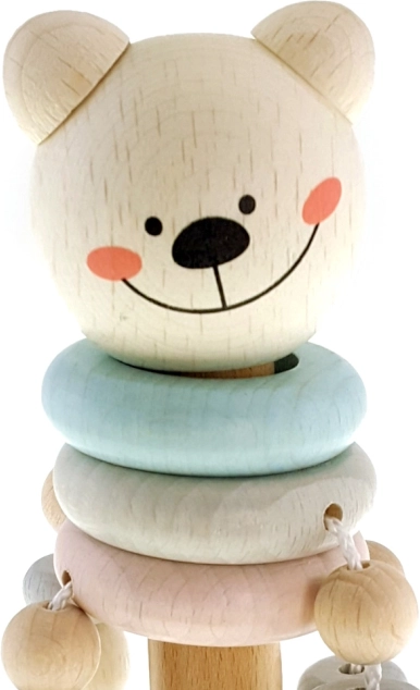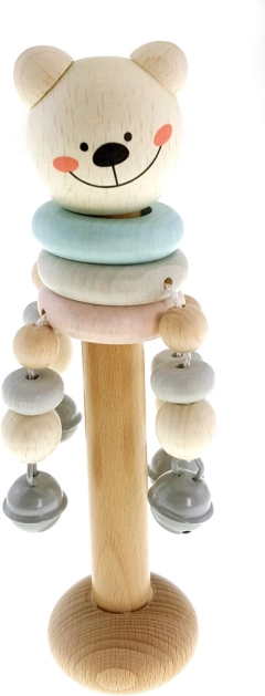 A HESS fa csörgő mackó alakban az első hang- és formafelfedezésekhez készült. A kellemes pasztellszínek, a sima felület és a csengettyűk ösztönzik a gyerekeket a megfogásra, rázásra és felfedezésre, ezáltal természetes módon fejlesztve a finommotorikát és az érzékelést.