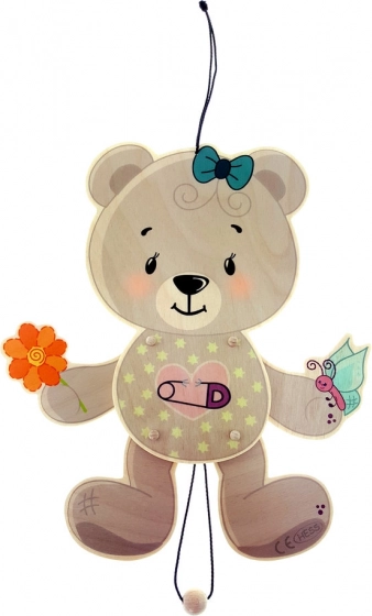 Ez a felfüggeszthető medve ideális kiegészítője minden gyerekszobának. 100% nyírfából készült, ennek köszönhetően nemcsak tartós, hanem környezetbarát is. Mozgatható részei, amelyek egy zsinór meghúzásával aktiválhatók, végtelen szórakozást nyújtanak, és fejlesztik a gyerekek motorikus képességeit.