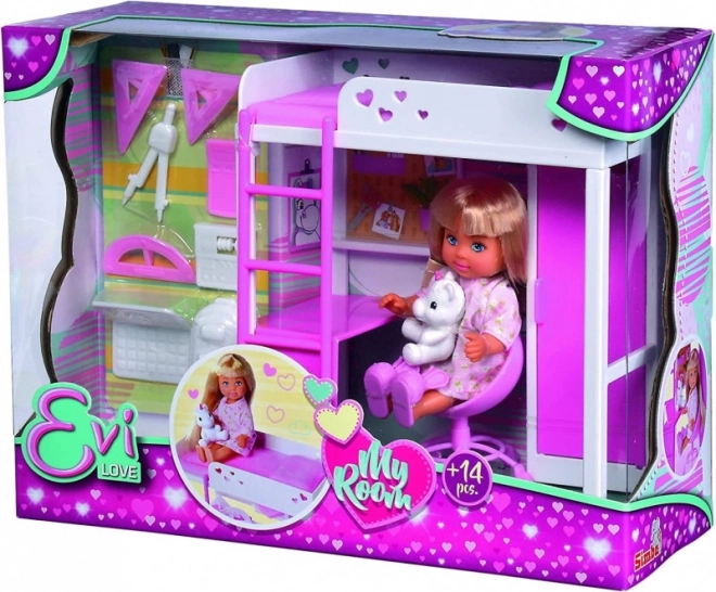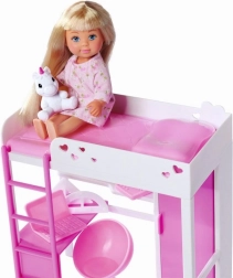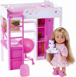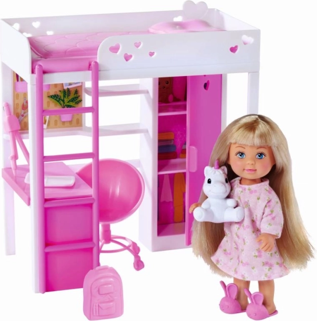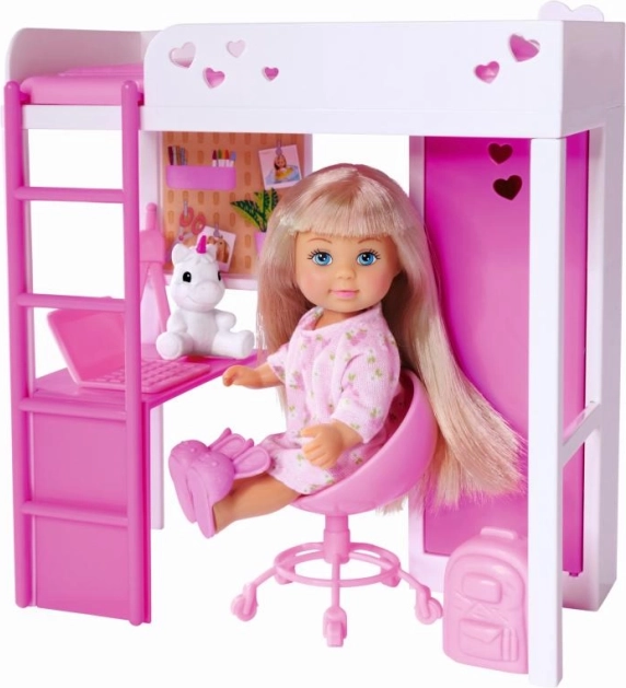 Fedezd fel a varázslatos szobácskát, ahol Evi baba játszik, tanul és pihen. A modern, létrás galériás ágy helytakarékos, alatta pedig kényelmes dolgozósarok bújik meg íróasztallal és tárolóhellyel. A fehér–rózsaszín árnyalatok finom szívecskékkel minden kis dizájnert elvarázsolnak.