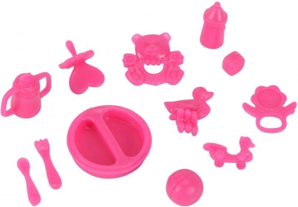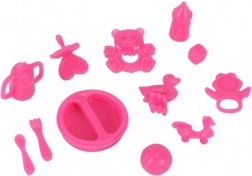 A készlet különböző rózsaszín műanyag játékokat tartalmaz, mint például tányér, evőeszközök és egy üveg, amelyek gazdagítják a játékélményt.