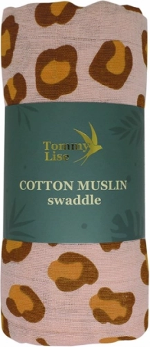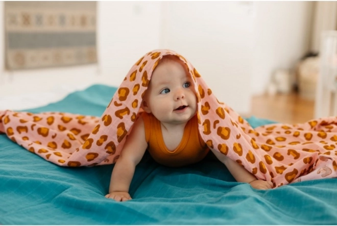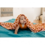 A 120 × 120 cm-es nagy méret tucatnyi felhasználást kínál: a pólyázástól a babakocsis takaráson át egészen az előkéig vagy alátétig. A korallszín tónusú leopárd mintázat szemet gyönyörködtető, és szépen illik a gyerekszobához és az utazó felszereléshez is.