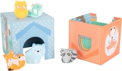 A kockákból magas tornyot lehet építeni, vagy egymásba lehet őket illeszteni. Az ablakok és ajtócskák bújócskára hívnak az állatkákkal, fejlesztve a fantáziát és a finommotorikát.