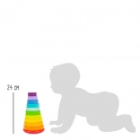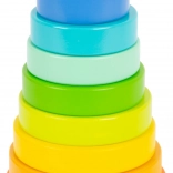 Emellett a torony lekerekített talppal rendelkezik, így rakosgatás közben billeg, ami tovább fokozza a játék élvezetét. A színes kialakítás támogatja a színek és a formák, valamint a különböző méretek felismerését.