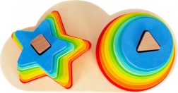 A Szivárvány Duo Rakosgatós Torony egy fa játék, mely a gyermekek tanulását és fejlődését támogatja. Lehetőséget kínál a darabok méret és forma - csillagok és körök - szerinti sorba rendezésére, élénk színekben. Ez a játék serkenti a színek felismerését és a koordinációs képességeket, miközben a gyermekek élvezettel építik a szivárványt.