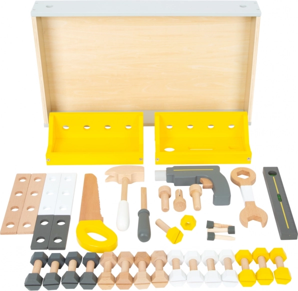 • Fa eszközök: Nyolc darabos készlet kalapácsot, fűrészt, csavarhúzót és további elemeket tartalmaz, teljes élményt nyújtva a valós műhelyi környezetből.